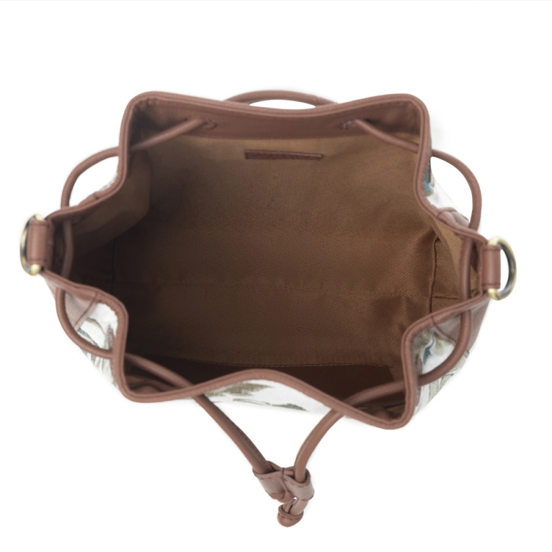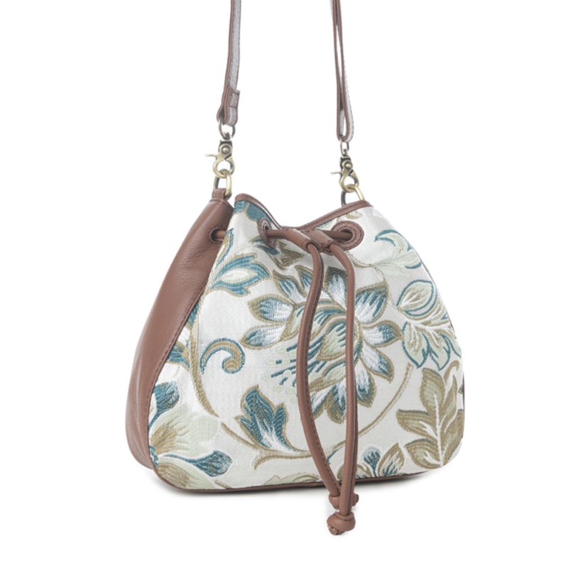 ALPINE is een kleine elegante leren crossbody schoudertas ook wel emmertas genoemd met aan de voor- en achterkant een luxe jacquard stof met een bloemenprint.