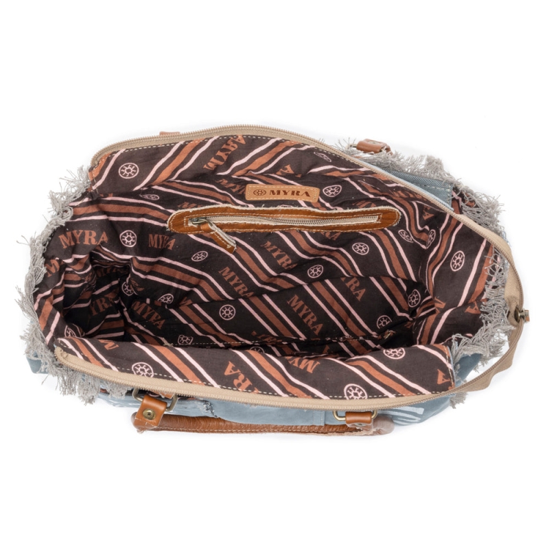 Let op: Alle tassen van Myra Bag zijn handgemaakt en uniek en kunnen qua print, koeienhuid, jeanssoort en afmetingen afwijken.