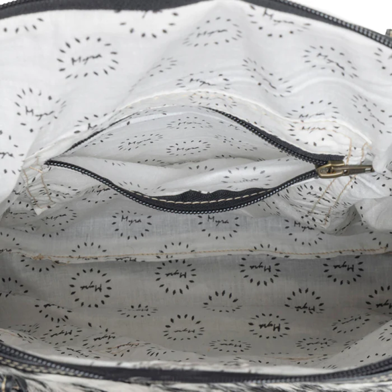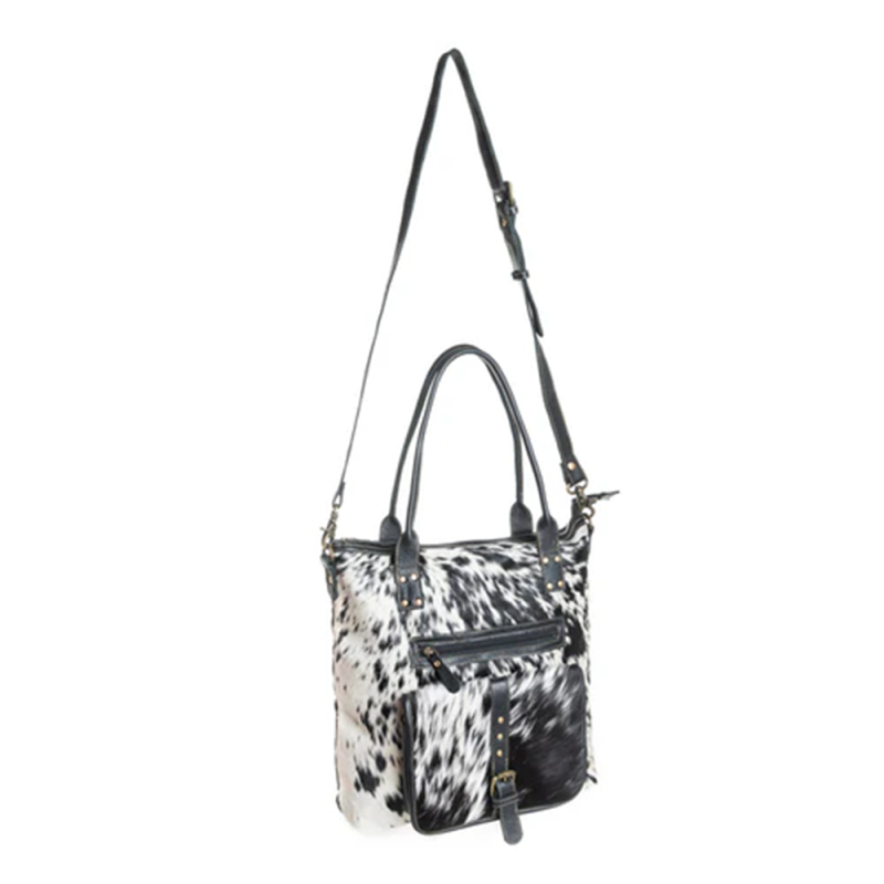 Let op: Alle tassen van Myra Bag zijn handgemaakt en uniek en kunnen qua print, koeienhuid, jeanssoort en afmetingen afwijken.