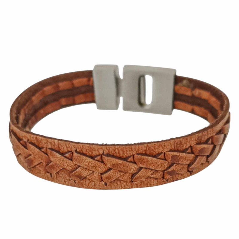 Deze armband is gemaakt van 14mm breed cognacbruin leer met een kruispatroon. De armband sluit met een BONHO matte zilverkleurige roestvrijstalen magneetsluiting.